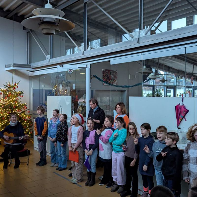 An den Adventsmontagen trafen sich die verschiedenen Klassenstufen gemeinsam vor der Mensa, um mit Unterstützung des Schulchors und Frau Bornier an der Gitarre Weihnachtslieder zu singen.