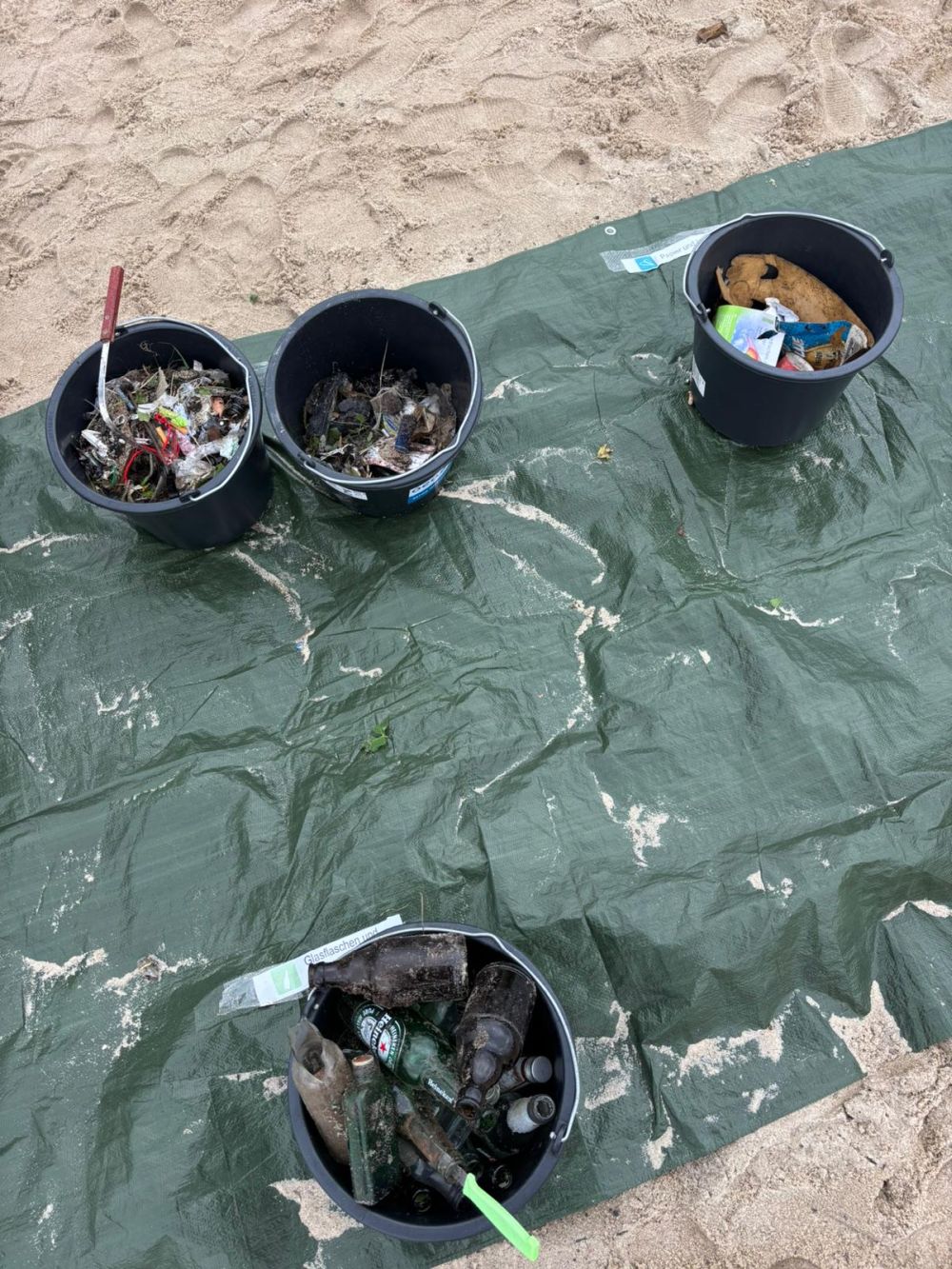 Erfreulicherweise war in diesem Jahr nicht ganz so viel Müll wie in den vergangenen Jahren am Strand zu finden, aber die Kinder sammelten trotzdem wieder einige Eimer verschiedener Müllsorten: Getränkeflaschen und -dosen, Plastiktüten, Bekleidung und Zigarettenkippen.